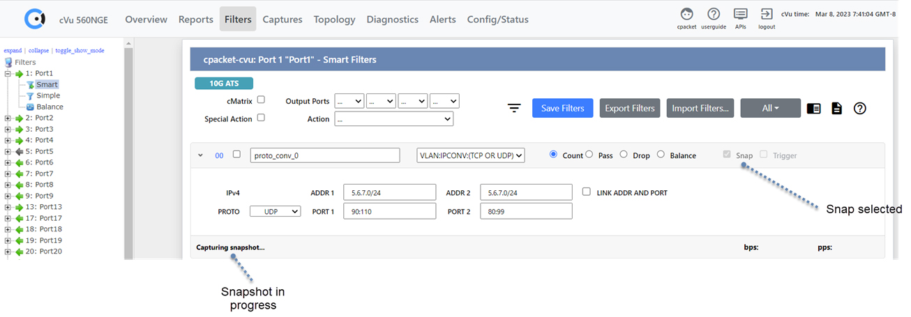 Snapshot gathers packets on the given port and Smart Filter for 10 seconds and then makes the .pcap file available for downloading. You can store multiple snapshots per port on the device or save an unlimited number offline. This allows you to track changes over time or take before-and-after snapshots and see the effect of changes in filter parameters and/or network configuration.